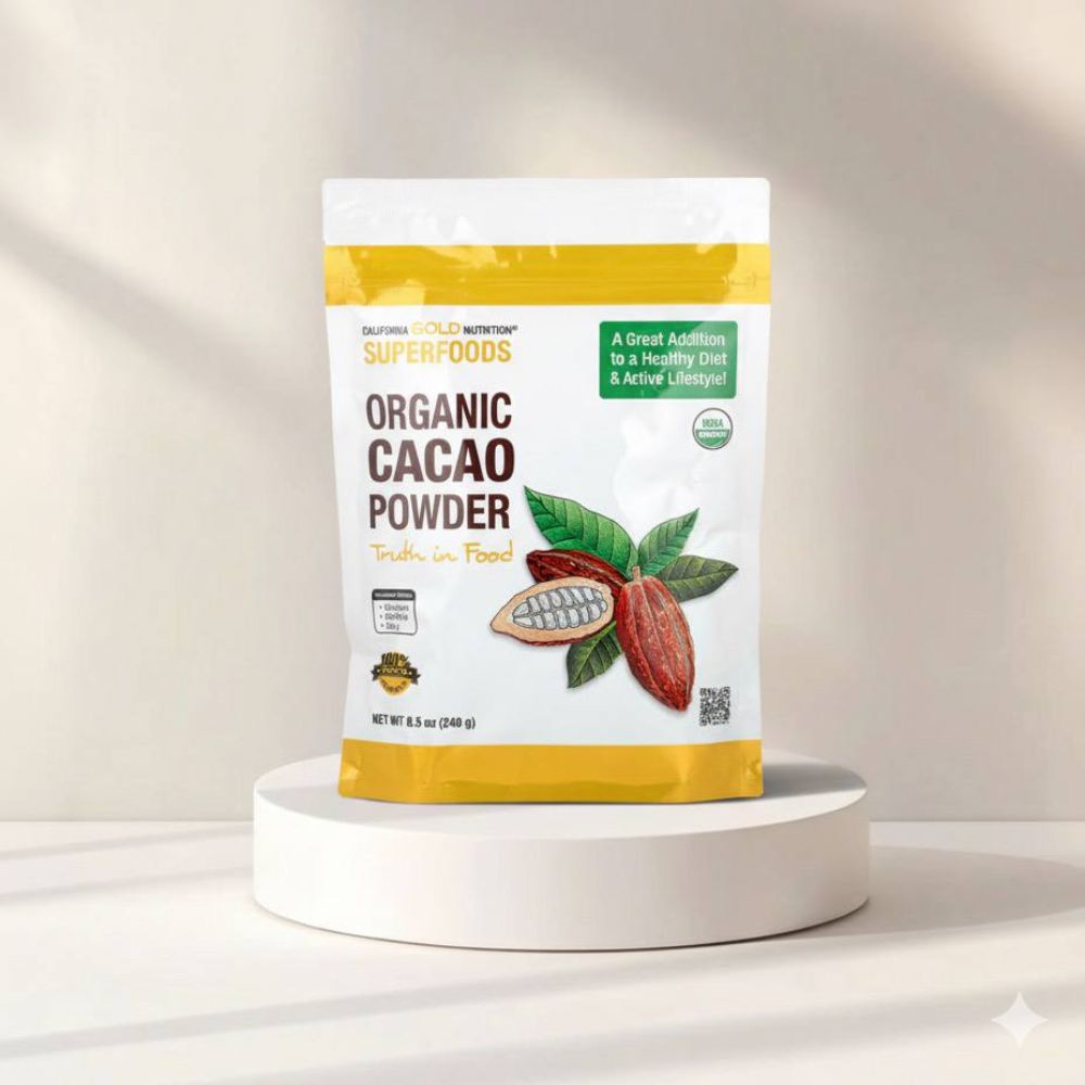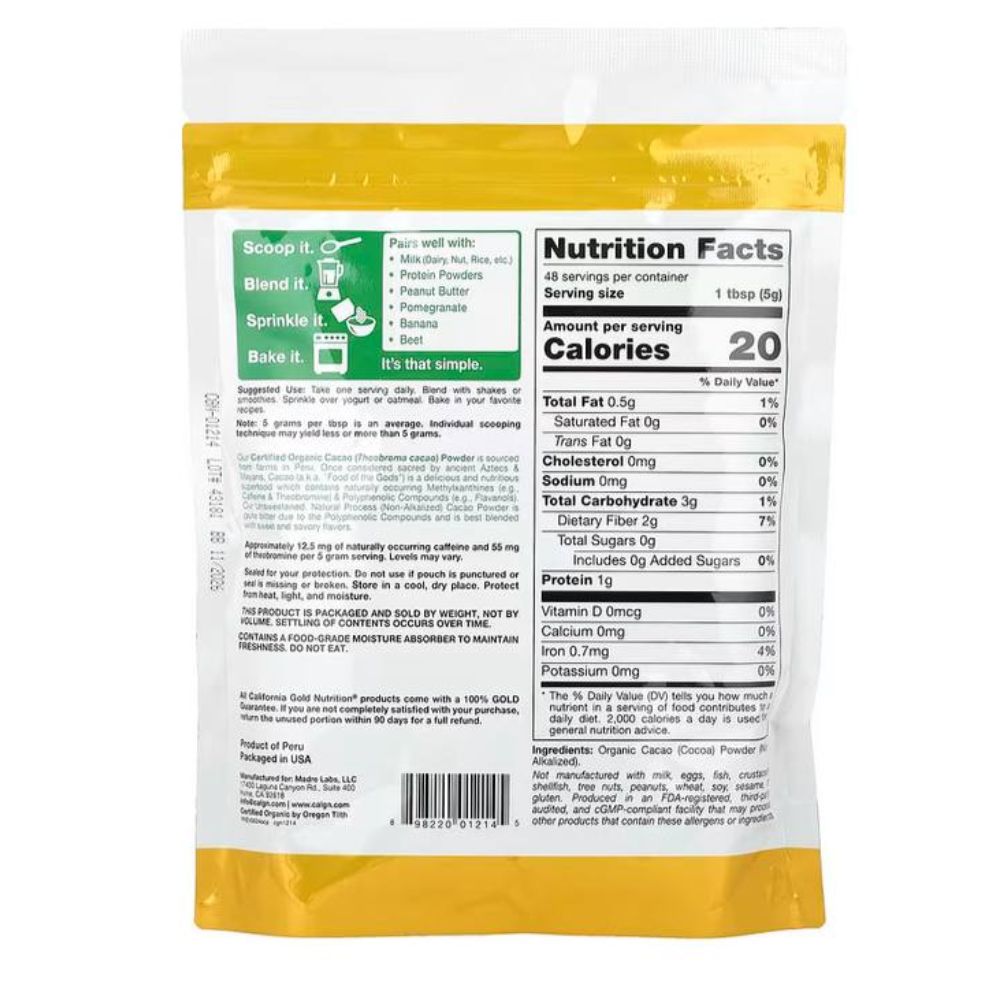 استمتعي بنكهة الكاكاو الغنية مع مسحوق الكاكاو العضوي من California Gold Nutrition®‎، المستخرج من أجود مزارع الكاكاو في بيرو. يتميز هذا المسحوق بطعمه الفاخر وتركيبته النقية غير القلوية (Natural/Non-Alkalized)، مما يجعله خيارًا غذائيًا ممتازًا للمخبوزات، العصائر، السموثي، الشوفان، والقهوة.