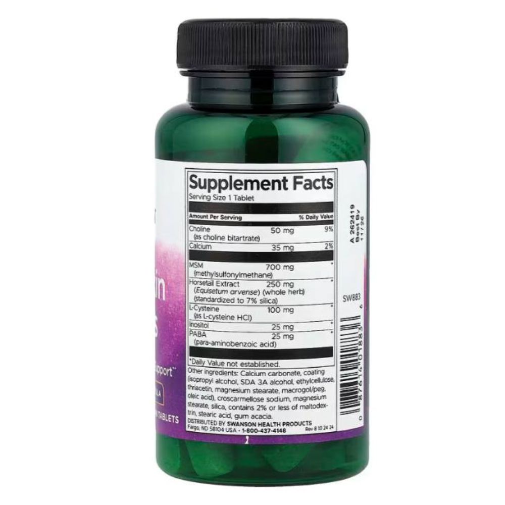 تجمع هذه التركيبة بين MSM (ميثيل سلفونيل ميثان)، والسيليكا المستخلصة من عشبة ذيل الحصان، وفيتامينات B الحيوية—وهي مكونات معروفة بدورها في تعزيز إنتاج الكولاجين الطبيعي، وتحسين مرونة البشرة، ودعم نمو الشعر وتقوية الأظافر بشكل ملحوظ.